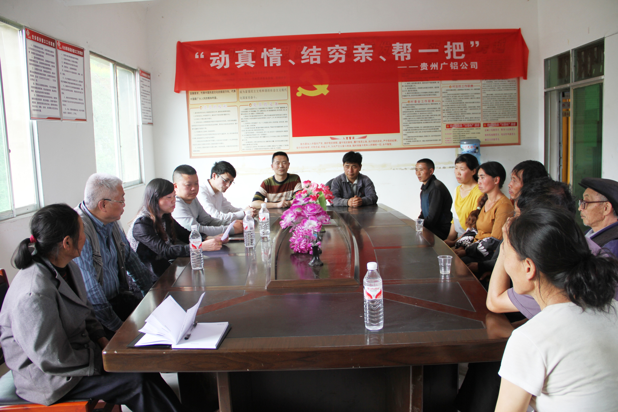 早晨,在貴州公司行政總經理兼工會主席周柯穎的帶領下,貴州廣鋁領導及員工一行人驅車來到了離公司十幾公里外的站街鎮貓場村。與此同時,農戶也在村支書的帶領下,早早地來到村委會等候。此次活動的幫扶對象為貓場村十戶貧困家庭。公司為每戶貧困戶帶去了1000元啟動資金。貴州公司人資處還與十戶貧困農戶分別簽定了《精準扶貧“動真情、結窮親、幫一把”協議書》,在力所能及的范圍內為他們提供就業等方面的幫助。