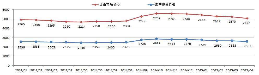 國內氧化鋁現貨交易市場趨于下跌。4月份上期所三月期鋁結算價加權平均值為13238.94元/噸,以17.3%作價4月份氧化鋁長單價為2275.02元/噸。1-4月份國內氧化鋁現貨價格和西南市場價格持續處于下跌趨勢,4月份下跌幅度分別為71元/噸、98元/噸。再加上部分地區氧化鋁現貨價格逐步接近長單比例價,并且氧化鋁企業利潤空間急劇縮水并貼近成本。預計氧化鋁市場將會迅速恢復理性走勢,價格也將止跌企穩。