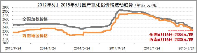 國產價格走勢偏弱。上半年國產氧化鋁價格維系了年初下滑的基本趨勢。截至6月16日,全國氧化鋁加權均價為2384元/噸,西南地區價格與全國加權均價的價差縮小至近50元/噸,同期均價為2330元/噸。其中,貴州均價為2340元/噸,略高于西南地區均價。從市場實際成交表現上看,雖然目前國產氧化鋁市場逐步恢復至去年平均水平,但在鋁價不景氣的環境下,氧化鋁市場價格難以堅挺。