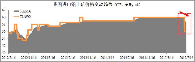 進口礦出現(xiàn)區(qū)間跳水現(xiàn)象。市場監(jiān)控數(shù)據(jù)顯示,自今年7月6日以來,我國進口鋁土礦到岸價(CIF)出現(xiàn)異常波動情況,CIF價格出現(xiàn)區(qū)間跳水現(xiàn)象。截至7月16日,我國進口鋁土礦30天移動平均價格(30EMA)已由60美元下跌至58美元,日均價格(T1AVG)下跌至56美元,區(qū)間降幅達7.1%。