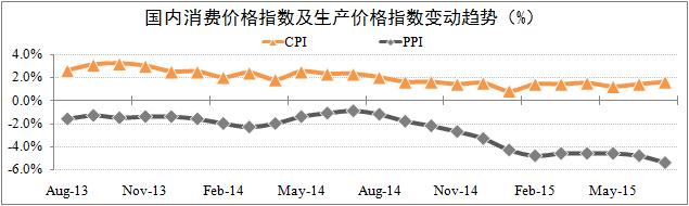 通貨緊縮預(yù)期增強(qiáng)。截至7月份,國(guó)內(nèi)價(jià)格總水平運(yùn)行依然偏弱,以消費(fèi)價(jià)格指數(shù)(CPI)和生產(chǎn)價(jià)格指數(shù)(PPI)為主的經(jīng)濟(jì)面出現(xiàn)“剪刀差”現(xiàn)象。數(shù)據(jù)顯示,7月份CPI環(huán)比上漲0.3%,同比上漲1.6%;PPI環(huán)比下降0.7%,同比下降5.4%。其中PPI已連續(xù)41個(gè)月出現(xiàn)負(fù)增長(zhǎng),且幅度逐月擴(kuò)大。CPI與PPI增幅差距的進(jìn)一步擴(kuò)大強(qiáng)化了國(guó)內(nèi)通貨緊縮預(yù)期,宏觀經(jīng)濟(jì)增長(zhǎng)風(fēng)險(xiǎn)加大。