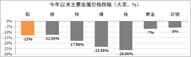 大宗商品價(jià)格走低。今年以來(lái),全球大宗商品價(jià)格出現(xiàn)顯著下跌現(xiàn)象,并引起近期大宗商品的拋售潮。有色金屬全線潰退,其中,鋁價(jià)下跌13%、銅價(jià)下跌12.5%。大宗商品價(jià)格走低暗示著全球經(jīng)濟(jì)增長(zhǎng)動(dòng)能相對(duì)缺失,綜合分析成因,主要包括以下三點(diǎn):一是大宗商品總體處于供過(guò)于求的狀態(tài);二是美元走強(qiáng),9月份加息預(yù)期增強(qiáng);三是新興市場(chǎng)經(jīng)濟(jì)體增長(zhǎng)疲軟。