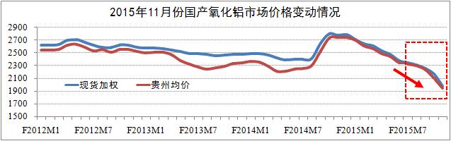 國(guó)內(nèi)價(jià)格方面:統(tǒng)計(jì)期內(nèi),全國(guó)氧化鋁市場(chǎng)價(jià)格繼續(xù)保持了今年以來(lái)的下行趨勢(shì),且下行幅度有所擴(kuò)大。其中:11月國(guó)產(chǎn)現(xiàn)貨加權(quán)1985元/噸,環(huán)比下降8.3%,降幅環(huán)比擴(kuò)大了4.1個(gè)百分點(diǎn);貴州均價(jià)1947元/噸,環(huán)比下降7.4%,降幅環(huán)比擴(kuò)大了1.4個(gè)百分點(diǎn)。研究認(rèn)為,目前氧化鋁市場(chǎng)價(jià)格直線下浮屬于異常現(xiàn)象,主要原因是電解鋁做空力量加劇了市場(chǎng)悲觀預(yù)期。