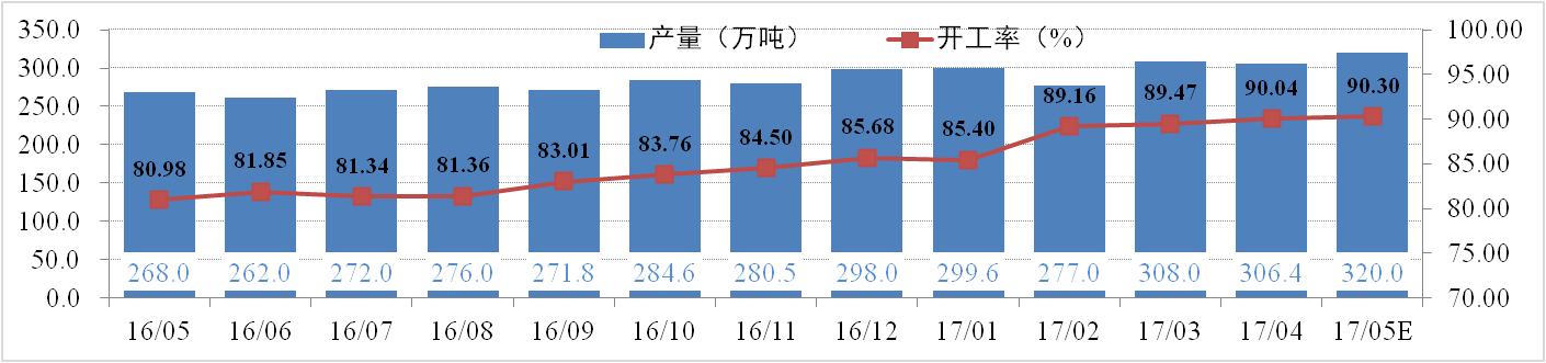 分析認為:供給側(cè)改革政策已經(jīng)落地,短期內(nèi)仍難以改變供需格局,因此市場供應仍將保持在高位。預期5月產(chǎn)量320萬噸,日化產(chǎn)量10.32萬噸,供應持續(xù)增加。