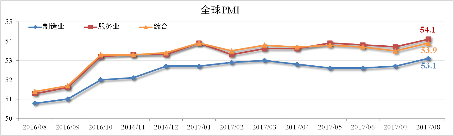 據HIS Markit與摩根大通發布的數據顯示,8月份全球綜合PMI為53.9,較7月擴大0.4個百分點,達2014年2月以來高點。其中服務業PMI為54.1,制造業PMI為53.1,均較上月擴大0.4個百分點。
