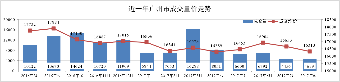 2017年8月,廣州一手住宅網簽呈現量增價跌現象。其中,一手網簽成交4689套,同比下降53.68%,環比上升5.23%;一手住宅網簽均價為16313元/平方米,同比下降8%,環比下跌2 %。