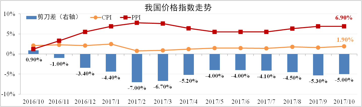 10月份我國CPI為1.9%,較上月擴(kuò)大0.3個(gè)百分點(diǎn),主要受食品價(jià)格跌幅縮小以及服務(wù)價(jià)格上漲所致。10月PPI為6.9%,超出市場預(yù)期,有色金屬礦石開采以及石油價(jià)格上漲是主要支撐力量。