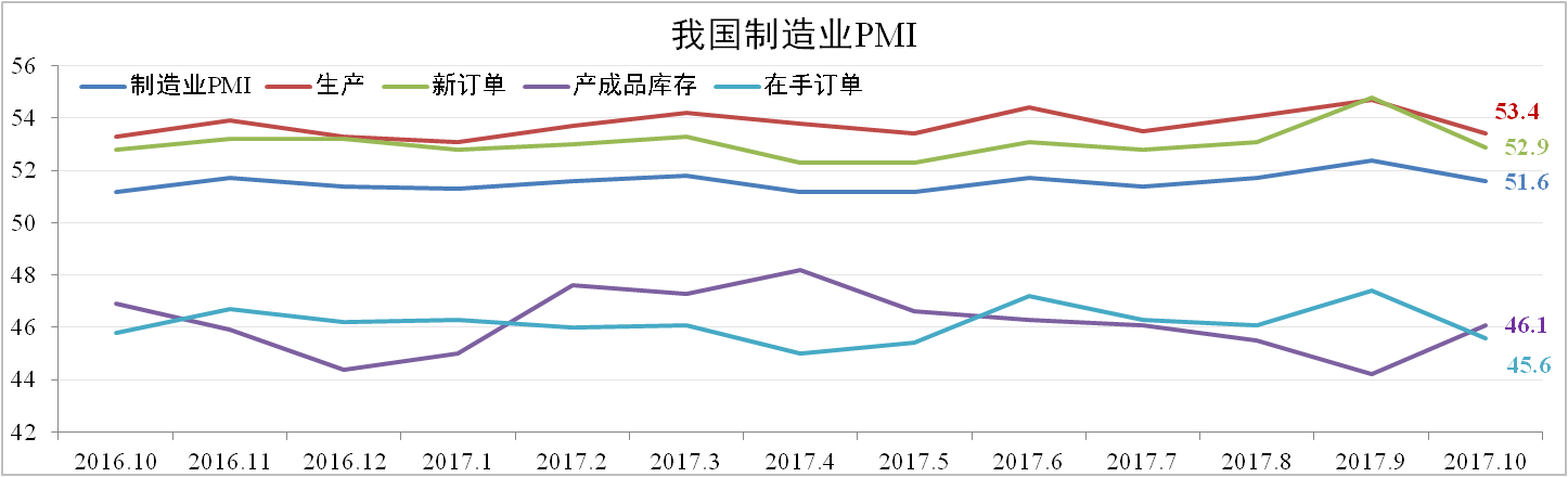 10月份我國官方制造業(yè)PMI為51.6,較上月回落0.8,達(dá)到年內(nèi)均值。從分項(xiàng)看,生產(chǎn)、新訂單與在手訂單紛紛下降,產(chǎn)成品庫存大幅上升,說明下游需求不足,制造業(yè)活動(dòng)較上月放緩。