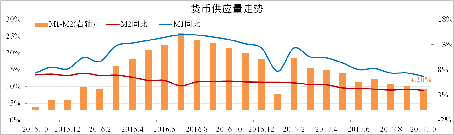 人民銀行數(shù)據(jù),10月份我國M2增速為8.8%,M1增速為13%,剪刀差較上月收窄0.6個(gè)百分點(diǎn)至4.2%。社會(huì)融資規(guī)模172.21萬億,同比增長12.99%,其中實(shí)體經(jīng)濟(jì)融資規(guī)模117.31萬億,同比增長13.51%。
