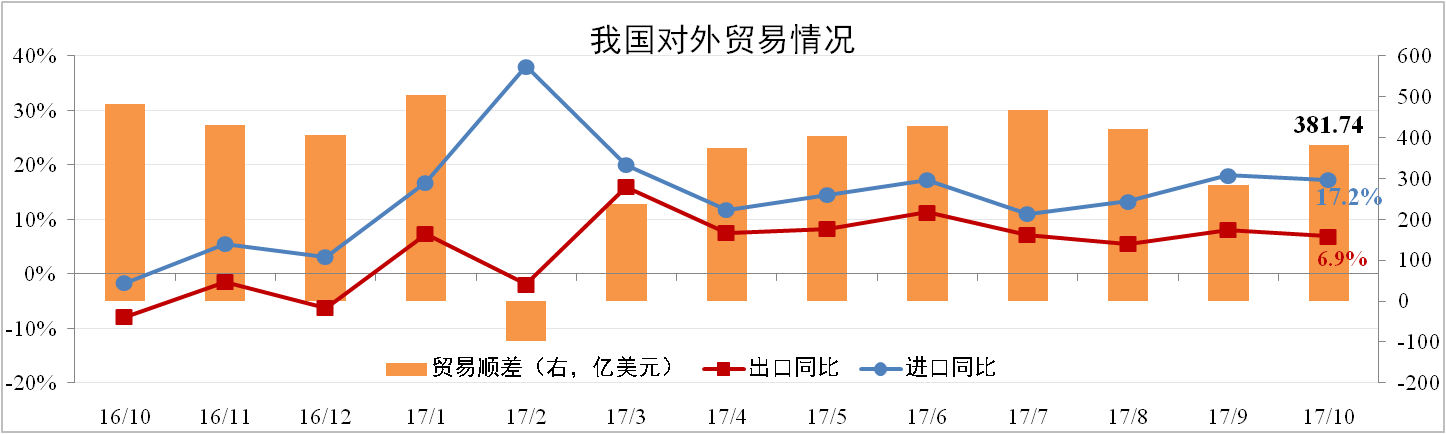 10月我國進(jìn)口量為1508.06億美元,同比上漲17.2%,出口量為1889.8億美元,同比上漲6.9%,其中機(jī)電與高新技術(shù)出口分別為8.2%與8.8%,高于總出口增速,出口結(jié)構(gòu)繼續(xù)改善。10月貿(mào)易順差381.74億美元,同比下降20.9%。