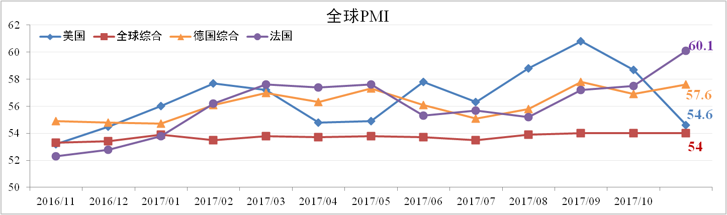 據(jù)市場調(diào)查機(jī)構(gòu)IHS Markit數(shù)據(jù)顯示,11月全球綜合PMI為54,持平于上月。發(fā)達(dá)國家表現(xiàn)有所分化,其中美國綜合PMI下滑至54.6,德國、法國綜合PMI則分別上揚(yáng)至57.6、60.1。