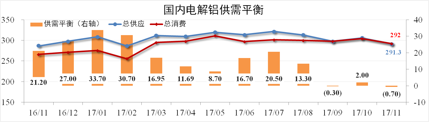 據(jù)阿拉丁數(shù)據(jù),11月份我國電解鋁產(chǎn)量291萬噸,同比上漲1.43%,環(huán)比下跌4.8%。凈進口0.3萬噸,總供應(yīng)量291.3萬噸,總消費量292萬噸,從靜態(tài)數(shù)據(jù)看,當(dāng)月理論供應(yīng)短缺0.7萬噸。