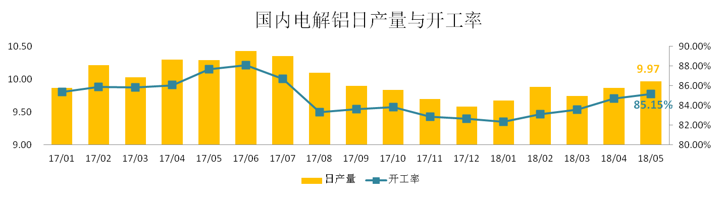 發(fā)稿時間:2018-06-225月份中國電解鋁總產(chǎn)能4369.8萬噸,運行產(chǎn)能3735.2萬噸,開工率85.15%,日產(chǎn)量9.97萬噸,環(huán)比上升1.26%。截至6月17日,2018年國內(nèi)新產(chǎn)能已投產(chǎn)51.7萬噸,待開工290萬噸,年內(nèi)在建且可投產(chǎn)新產(chǎn)能369.5萬噸。