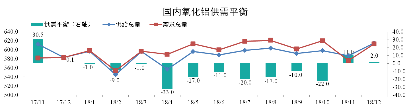 截至12月底,我國氧化鋁建成產能8387萬噸,運行產能7549萬噸,開工率90.01%,環比上漲2.64個百分點。其中國內氧化鋁產量637萬噸,出口氧化鋁22萬噸,供給總量615萬噸,測算的需求量為613萬噸,靜態理論過剩 2萬噸。