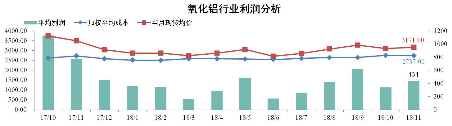 11月份國內氧化鋁加權平均成本為2737元/噸,較上月下降0.76%。當月全國氧化鋁現貨成交均價為3171元/噸,較上月上漲2.30%。理論氧化鋁行業平均利潤水平為434元/噸。