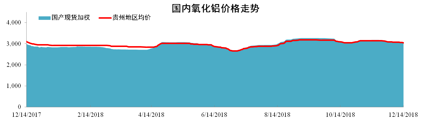 截至12月14日,國產氧化鋁現貨加權均價為3040元/噸,同比上漲1.33%,環比下降0.23%。貴州地區氧化鋁現貨加權均價為3050元/噸,同比下降1.61%,環比下降0.23%。