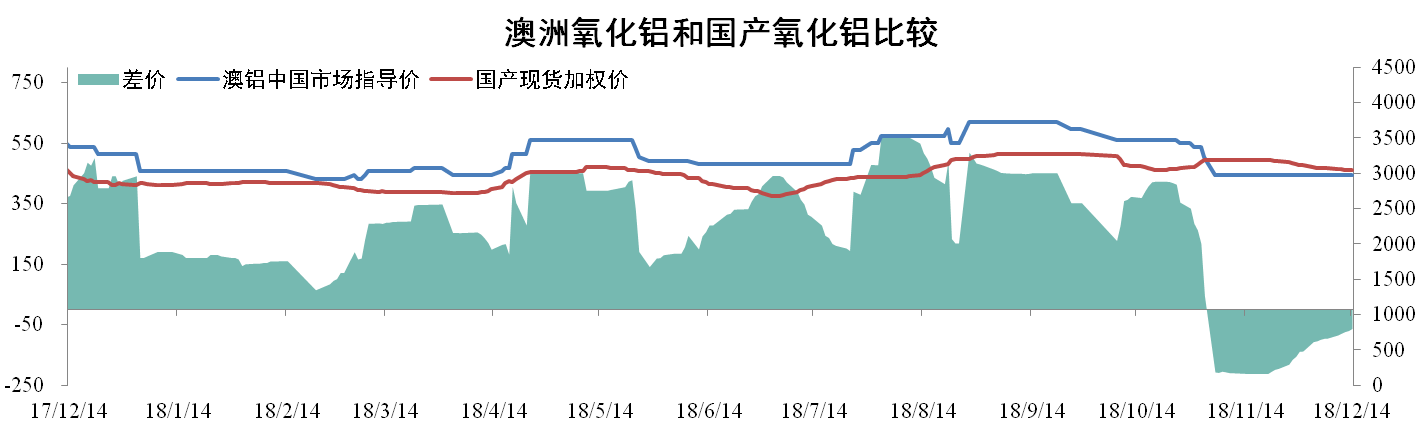 截至12月14日,國產氧化鋁現貨加權均價為3040元/噸,環比下降0.23%。澳鋁中國市場指導價為2975元/噸,同比下降11.85%,國產氧化鋁價格較澳鋁指導價高出65元/噸。