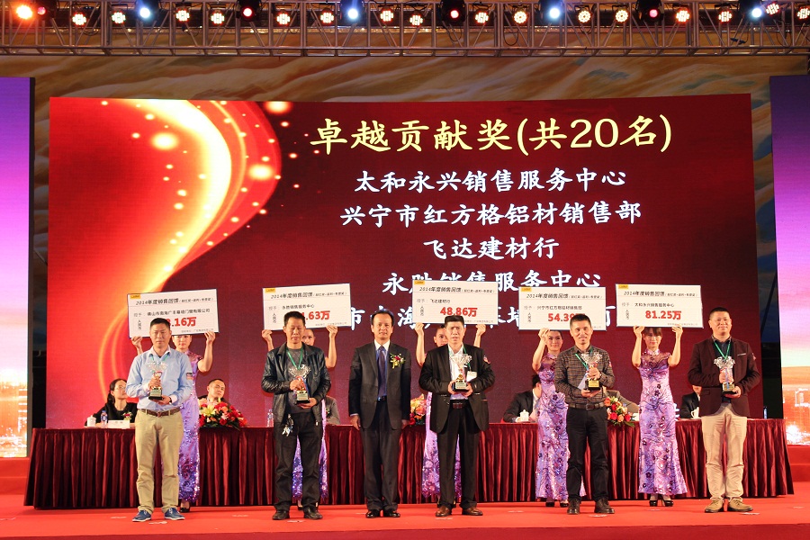 17日上午10:00時,年會正式開始。首先,由廣鋁鋁業(yè)公司營銷總經(jīng)理占振德致歡迎辭,對所有嘉賓的到來表示了最熱烈的歡迎和最衷心的感謝!接著,廣鋁鋁業(yè)公司總經(jīng)理黎柏松對2014年度廣鋁鋁業(yè)公司的各項工作做了詳細(xì)的總結(jié)并對2015年的鋁業(yè)經(jīng)營發(fā)展指明了方向,向廣大渠道戰(zhàn)略合作伙伴的工作開展提出了建設(shè)性意見,明確了與廣大渠道戰(zhàn)略合作伙伴共同成長、共同分享發(fā)展成果的舉措。此后,廣鋁幕墻公司董事長吳國權(quán)與大家分享了《廣鋁——建筑系統(tǒng)提供商》,就廣鋁的服務(wù)范圍、經(jīng)營模式做了詳細(xì)的解析。最后,集團公司領(lǐng)導(dǎo)對過去一年中表現(xiàn)卓越的戰(zhàn)略合作伙伴進行了頒獎。在頒獎典禮上,共頒發(fā)了10名渠道制勝獎、10名飛躍新星獎、10名精誠合作獎、10名股紅獎和20名卓越貢獻獎。其中,集團董事兼總裁夏文鋒親自為20名卓越貢獻獎的合作伙伴頒發(fā)了獎金。