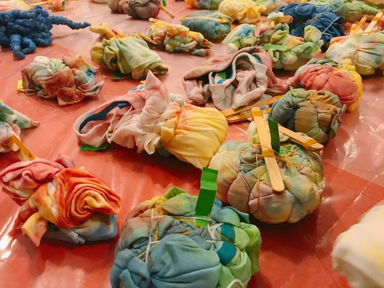 經(jīng)過了兩個(gè)小時(shí)的扎染實(shí)踐,參加本次課程的家庭都已全部完成了自己的作品。扎結(jié)每種花,即使有成千上萬朵,染出后卻不會有相同的出現(xiàn),趣味無窮,展開后的扎染作品更是絢爛多彩。家長們和孩子一起感受扎染工藝的魅力,不僅是親子互動的溫馨時(shí)刻,更是一場別開生面的傳統(tǒng)文化教育。激發(fā)了孩子們豐富的想象力,鼓勵(lì)他們大膽地去創(chuàng)作,激發(fā)孩子們的想象力及動手能力。