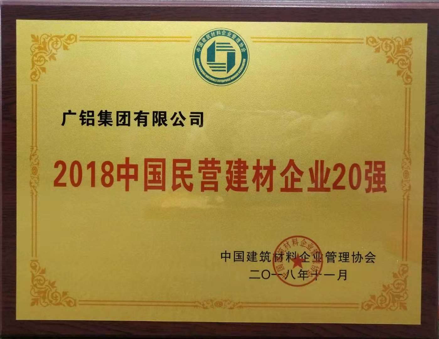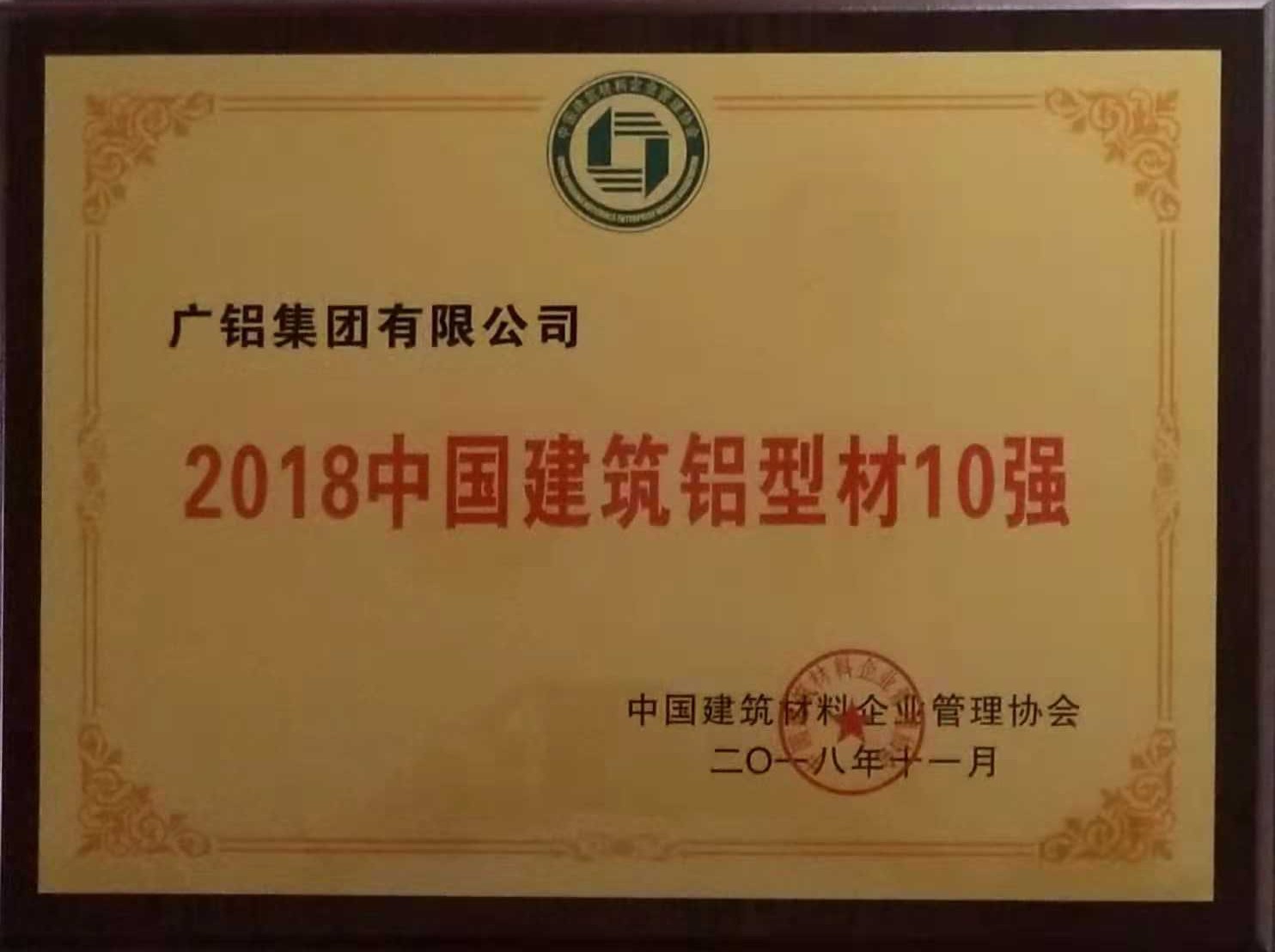 廣鋁榮獲“2018中國建材企業50強”、“2018中國民營建材企業20強”、“2018中國建筑鋁型材10強”稱號