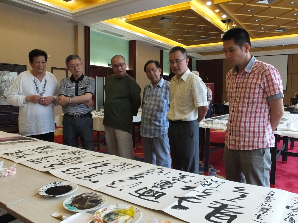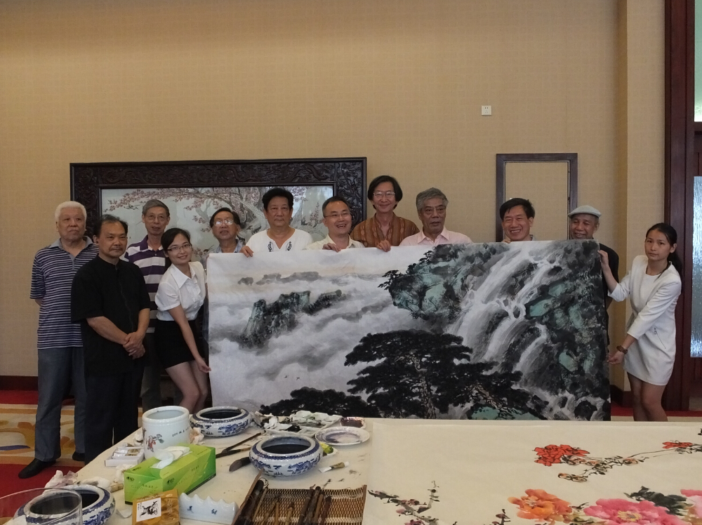 在廣州畫壇,李筱孫、葉泉、許固令、陳永康、盧德平、招熾挺、黃樹文、陳永鏘、陳孝能九位畫家常常在一齊談藝論道,因而被行內人雅尊為“羊城九老”。幾十年來,九位畫友一直以文會友,以畫交心,情誼深厚。此次“羊城九老”應邀光臨廣鋁集團總部,葉鵬智董事長盛情接待了他們,并就集團的發(fā)展歷史、經營戰(zhàn)略、企業(yè)文化向他們做了介紹;葉董事長還與他們一起用餐、座談。隨后“羊城九老”便在展廳里談笑風生、吟詩作對并聯(lián)手作畫贈予公司留作紀念。其畫雖由九人聯(lián)手所作,卻猶如出自一人之手,渾然天成,氣勢不凡,可見他們的畫藝是何等精湛、情誼是何等深厚!九位畫壇耆英年紀雖已過半百,但他們依舊笑笑鬧鬧,直言不諱,童心未泯,表現(xiàn)出藝術家對待人生的樂觀曠達。