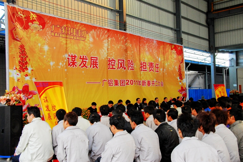 新春伊始,在企管事業部全體人員的組織安排下,我司2011年江高總部新春開工大會于2011年2月14日8:30時在江高噴涂車間包裝部正式舉行,秉承廣鋁集團持續發展力高層論壇會會議精神,大會主題定為“謀發展、控風險、擔責任”,出席大會的相關領導有葉董事長、吳副總裁、王副總裁、邱副總裁、結算事業部黃總經理、國內營銷中心兼營銷策劃中心李總監、結算事業部尹總監、企管事業部梁總助、科技公司吳副總、國際營銷中心溫總助、生產中心劉總助、鋁制品公司黃總助。